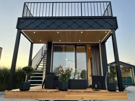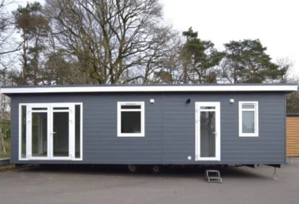 Casa móvil de madera 45 m² nueva 10×4,5m con porche convertible.