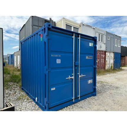 Contenedor marítimo de 10 pies Dry Van (DV) en color RAL 5010 (azul), disponible bajo pedido. Dimensiones exteriores: 2,425 m x 2,975 m x 2,54 m. Peso de 825 kg. Compacto y robusto, ideal para almacenamiento en espacios reducidos como patios, obras, comercios o garajes. Fabricado en acero resistente con suelo de madera tratada. Fácil de transportar gracias a su tamaño y peso. Entrega rápida en 4-5 días a toda España.