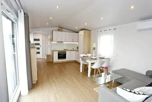 Casa móvil T2 Agla completamente equipada de 38,5 m² (10 x 3,85 m) con 2 dormitorios para 4 personas, cocina, baño y aislamiento total. El precio original era: € 5.020,00.El precio actual es: € 4.267,00. IVA incluido