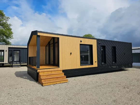 Casa móvil Shadow moderna con revestimiento madera 3 ventanas y porche.