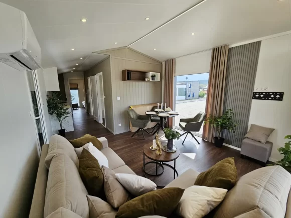 Totalmente climatizada con ventilación específica en el salón y estándar EH40 (con opción solar), garantiza confort óptimo durante todo el año mediante sistema de calefacción, refrigeración y excelente aislamiento. La distribución incluye 3 dormitorios independientes y baño completo, ofreciendo capacidad para 6-8 personas con privacidad total.​