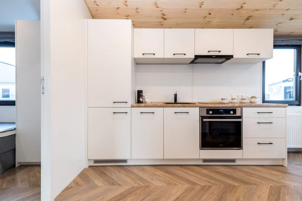 La cocina independiente con iluminación LED empotrada, fregadero conglomerado 620x500mm + grifo cromado suelo eleva estándares culinarios sobre diseños abiertos, garantizando privacidad cocción durante convivencias simultáneas. El techo madera natural + iluminación cumbrera crean ambiente escandinavo cálido, mientras calefacción gas eficiente complementa aire acondicionado split 1+1 (interior/exterior) para habitabilidad 12 meses.
