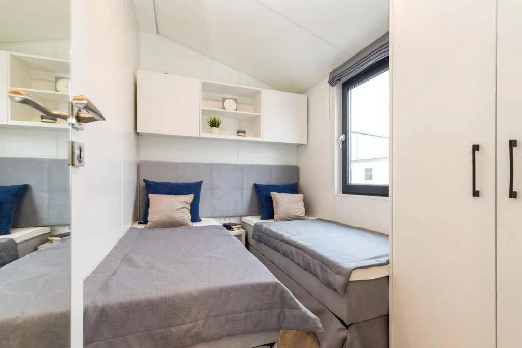 Casa móvil moderna Milford 34,4 m² construida en alerce siberiano aislante con salón luminoso zona día/noche separada, cocina exclusiva y climatización completa gas/aire acondicionado.