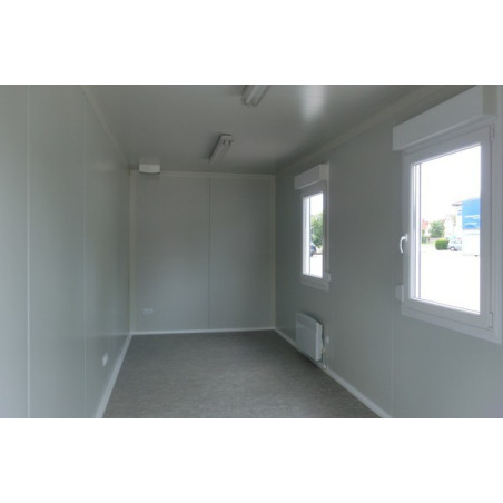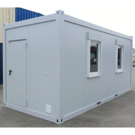 Contenedor marítimo de 20 pies transformado en módulo habitable, nuevo y listo para usar. Equipado con 2 ventanas de PVC oscilobatientes con persianas y 1 puerta de acero. Cuenta con aislamiento térmico, instalación eléctrica completa (iluminación LED, tomas de corriente) y convector eléctrico para calefacción. Ideal para oficinas de obra, almacén con confort, taller, vestuario o espacio auxiliar. Fácil de transportar e instalar.