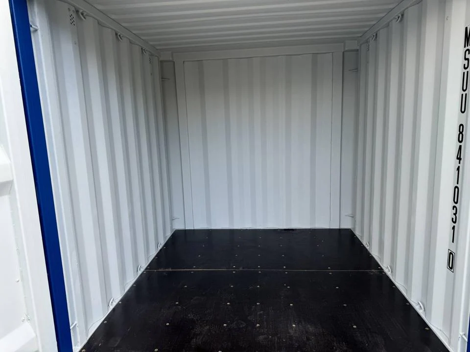 Contenedor 8 pies virgen con puertas 2,05x2m, peso vacío 950 kg y capacidad bruta 10.000 kg, perfecto sitios estrechos donde 20/40 pies resultan sobredimensionados.