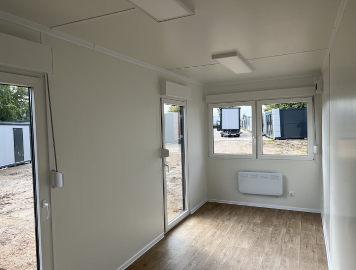 El contenedor de oficina profesional por excelencia. Este módulo estándar de 6×2,43 metros ofrece una construcción de acero soldado de altísima calidad (perfiles S235 de 3mm), aislamiento integral de lana mineral (hasta 100mm) y un acabado interior en panel blanco. Incluye 3 grandes ventanas de PVC con persiana, puerta Hörmann ZKI60, instalación eléctrica VDE empotrada con toma 380V y suelo PVC. Robusto, duradero y listo para personalizar.