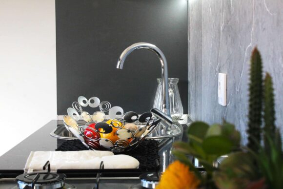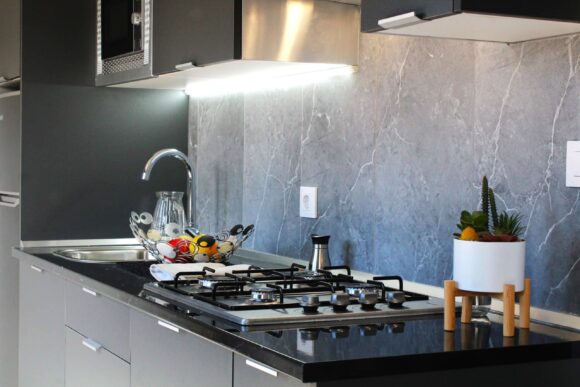 • Cocina abierta: microondas, extractor, cocina gas, nevera, fregadero, azulejos porcelánicos​
