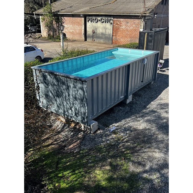 Fabricada sobre la base de un robusto contenedor de 20 pies de un solo uso, esta piscina ha sido transformada meticulosamente para ofrecer un rendimiento y una experiencia de usuario excepcionales. No es solo una piscina; es un gimnasio acuático, una zona de relax y una pieza arquitectónica única para tu hogar.