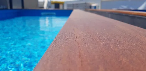 Bordes de Madera Exótica Autoclavada: Un detalle de lujo. Los bordes superiores de la piscina están rematados con madera exótica tratada en autoclave, que garantiza una resistencia total a la humedad, los insectos y la intemperie, manteniendo su belleza natural durante años.
