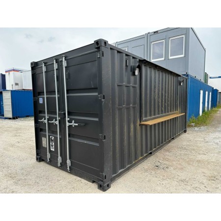 Contenedor de catering de 20 pies High Cube (HC) transformado sobre base marítima, ideal para hostelería y comercio. Superficie útil de 14,8 m², dimensiones exteriores: 6,06 m x 2,44 m x 2,90 m. Equipado con cilindros neumáticos para elevar las paredes laterales, creando un espacio abierto y funcional. En buen estado, listo para usar en eventos, ferias o ubicaciones fijas. Aproveche su versatilidad para food trucks, bares efímeros o puntos de venta. Entrega rápida en 4-5 días a toda España.